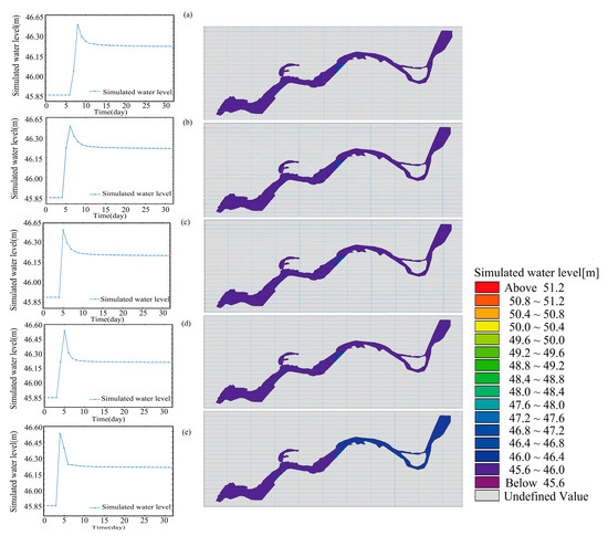 Typical discharge of 115, 165, 190, 215, 265 m3/s water level changes. Hydrodynamic simulation diagram and corresponding simulated water level diagram of flow rate 115 m3/s (a), hydrodynamic simulation diagram and corresponding simulated water level diagram of flow rate 165 m3/s (b), hydrodynamic simulation diagram and corresponding simulated water level diagram of flow rate 190 m3/s (c), hydrodynamic simulation diagram and corresponding simulated water level diagram of flow rate 215 m3/s (d), hydrodynamic simulation diagram of flow 265 m3/s and corresponding simulated water level diagram (e).