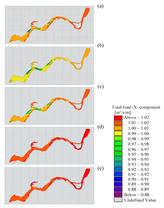 Spatial distribution of sediment at typical flows of 115, 165, 190, 215, and 265 m3/s, Sediment simulation diagram (a) of flow 115 m3/s, sediment simulation diagram (b) of flow 165 m3/s, sediment simulation diagram (c) of flow 190 m3/s, sediment simulation diagram (d) of flow 215 m3/s, and sediment simulation diagram (e) of flow 265 m3/s.