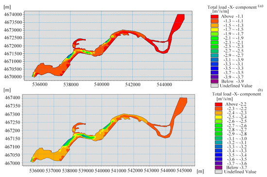 The spatial distribution of sediments in the study area at different time periods under short-term and long-term scenarios was obtained by numerical simulation. The distribution diagram of sediment at the end of the simulation in the near term and the distribution of sediment at the end of the simulation in the long term are shown in Figure 8. In the short term, the sediment value is −1.1~−2.7 m, and in the long term, the sediment value is −2.3~−3.3 m. The spatial distribution of sediment shows a decreasing trend, but the sediment deposition area is mainly at the entrance of the reservoir, and the decrease of sediment deposition in the entrance area is less than that in the outlet area. The discharge rate is 165~190 m3/s, and the sediment deposition is effectively regulated. With the increase of runoff, the hydrodynamic erosion and deposition capacity is also improved within the discharge range, which not only reduces the difficulty and cost of silting but also guarantees the water transmission capacity of the reservoir area.