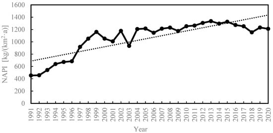 | Year | Pfer [kg/(km2·a)] | Pim [kg/(km2·a)] | NAPI [kg/(km2·a)] |