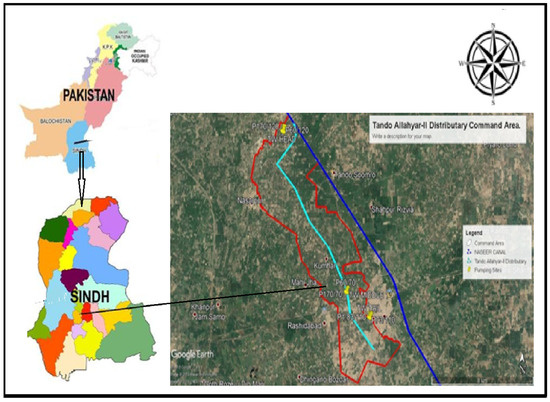 The Tando Allahyar-II distributary command area, located in the Tando Allahyar district, was selected as the study area (Figure 1). The command area of Tando Allahyar-II distributary covers 5486 hectares. Most of this area is situated in the serpentine flood plain of the Indus River and is characterized by abandoned waterways, old meandering scars, embankments, dams, and bars. The geological profile of the pumping sites reveals that the upper layers consist of predominantly clay soil, ranging in thickness from 0.5 m to 25.91 m. Below these clay layers, the aquifer is primarily composed of sandy textures. The distributary’s head works are situated at coordinates 25°33′35″ N, 68°38′59″ E, with an elevation of 26 m, while the tail of the distributary is positioned at coordinates 25°27′13.74″ N, 68°41′56.08″ E, with an elevation of 20 m.
