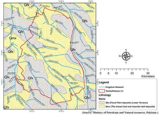 The geological map of the Tando Allahyar district is shown in Figure 2. The district Tando Allahyar is located on the left bank of the Indus River. Geologically, it mostly contains alluvium, sand, silt, and gravel. The predominantly southern-based lithology of the Indus Basin can be divided into five sedimentary units: basal sand unit, lower shale, middle sand unit, upper shale, and upper sand. The Upper Goru sequence of Middle to Late Cretaceous conformably overlies the Lower Goru formation that consists of mainly marl and calcareous sandy clay occasionally interblended with silt and limestone. The main recharging source of aquifer recharging in the study area is the Naseer Branch canal. This canal water seeps into sediments and recharges groundwater aquifers. This area is rich in fresh groundwater up to 100 m; this is due to the historical Indus courses of fresh water for many centuries before the 1890s. The groundwater quality at deeper depths is highly saline. However, a layer of fresh water of varying quality is present with varying thickness of 75 to 125 m of the aquifer in the areas of favorable lithologies where sources of groundwater recharge are available.