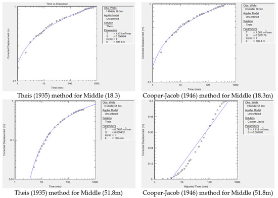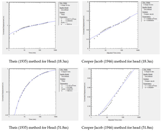 Transmissibility and coefficient of storage were determined using the AQTESOLV software by Theis and Cooper–Jacob [20,21], and their approaches and results are shown in Figure 3. The transmissivity (T) values of observation wells were 0.9717 m2/min and 2.125 m2/min, which were obtained by using Theis’s approach, whereas the storativity (S) values of observation wells were 0.002035 and 0.01466 using a similar approach at the head of the distributary for P 18.3 m and P 51.8 m, respectively. Here, the transmissivity was 0.9858 m2/min and 1.033 m2/min and the storativity was 0.0005655 and 0.002661, respectively, for P 18.3 m and P 51.8 m. Since the difference between the estimated parameters for both approaches is very small, thus, the average of the two approaches is considered as a representative. Consequently, at the head of the research area, the average transmissivity (T) calculated was 0.97875 m2/min and 1.579 m2/min, and the average storativity obtained was 0.0013 and 0.00866 for P 18.3 m and P 51.8 m, respectively.
