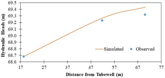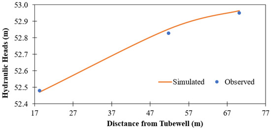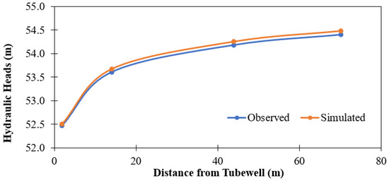 The process of calibration [26,27,28] is a workout that uses a sensitivity approach to modify geological formation properties, time stresses, and boundary circumstances until the historical situations of geological formation flow and head are reproduced with appropriate precision. The initially recorded data assigned to the model were aquifer parameters such as topographical view, shape, altitude, and soil characteristics for all soil strata in geological formation. Throughout pumping tests, values assigned to the model for recharge were taken into consideration as seepage and infiltration from irrigation canals and irrigation applications. Water drained from the system is only considered to be pumped from the well, while the evapotranspiration is insignificant. By means of a trial-and-error approach, the final choice of model factors was achieved. Throughout the process of calibration, the hydraulic properties of the model lenses varied amongst the simulation outcomes of the model and the measured data until there was sufficient correspondence for transient’s groundwater flow. Quite a lot of simulations were performed during the calibration process, and the hydraulic factors of aquifers were changed until the simulated head was attained very near to the measured data as shown in Figure 5Figure 6andFigure 7.