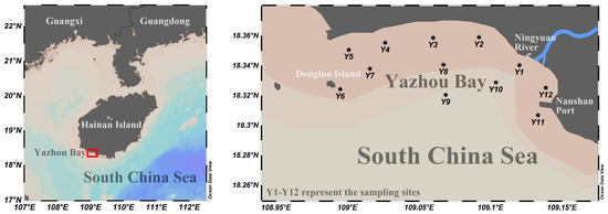 Twelve sites were deployed in Yazhou Bay, encompassing the Ningyuan River Estuary, Nanshan Port, other nearshore waters, Dongluo Island, and the offshore area. Field observations of phytoplankton and related ecological environmental indicators, as well as water sample collections, were conducted once during each of three distinct periods: the winter northeast monsoon (January 2023), the spring monsoon transition (April 2023), and the summer southwest monsoon (August 2023).