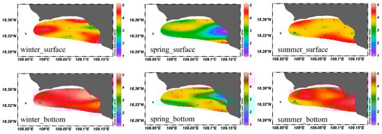 Seasonal variation in Shannon–Wiener diversity index (H′) at surface and bottom water layers in Yazhou Bay. The color bars indicate the level of the Shannon–Wiener diversity index.