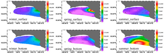Seasonal abundance distribution at surface and bottom water layers in Yazhou Bay. The color bars indicate the level of phytoplankton abundance (cells·L−1).