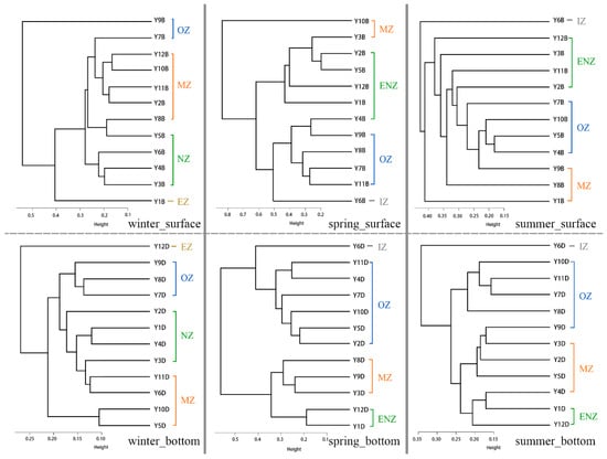 A hierarchical clustering method was used to analyze the phytoplankton community structure, delineating different subgroups based on geographic locations and environmental features (Figure 4 and Figure S1). These subcommunities displayed distinct regional characteristics—estuary, nearshore, island, and open sea—reflecting varying influences from open ocean water masses and terrestrial inputs. The corresponding habitats were classified into an Offshore Zone (OZ), Mixed Zone (MZ), Estuary and Nearshore Zone (ENZ), and Island Zone (IZ). In winter, the estuarine and nearshore area was further divided into an Estuary Zone (EZ) and Nearshore Zone (NZ) based on subcommunity differences.