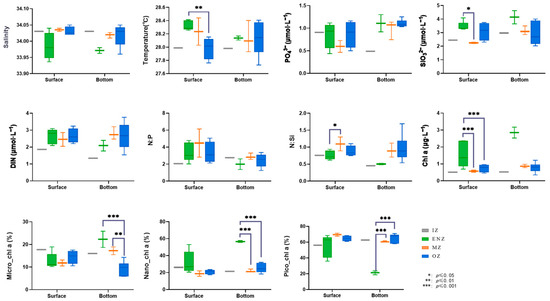 Regional variation in environmental and biological parameters in the surface and bottom water layers of Yazhou Bay during summer: salinity, temperature, phosphate (PO43−), silicate (SiO32−), ammonium (NH4+), oxynitride (NOX), dissolved inorganic nitrogen (DIN), nitrogen phosphorus ratio (N:P), nitrogen silicon ratio (N:Si), chlorophyll a (Chl a), percentage of micro-phytoplankton (Micro_chl a (%)), percentage of nano-phytoplankton (Nano_chl a (%)), percentage of pico-phytoplankton (Pico_chl a (%)). One-way ANOVA was conducted for the environmental factors of the zones covering 2 or more stations (NZ, MZ, and OZ). * represents p-value ≤ 0.05, ** represents p-value ≤ 0.01, *** represents p-value ≤ 0.001.