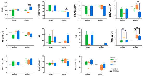 Regional variation in environmental and biological parameters in the surface and bottom water layers of Yazhou Bay during winter: salinity, temperature, phosphate (PO43−), silicate (SiO32−), ammonium (NH4+), oxynitride (NOX), dissolved inorganic nitrogen (DIN), nitrogen phosphorus ratio (N:P), nitrogen silicon ratio (N:Si), chlorophyll a (Chl a), percentage of micro-phytoplankton (Micro_chl a (%)), percentage of nano-phytoplankton (Nano_chl a (%)), percentage of pico-phytoplankton (Pico_chl a (%)). One-way ANOVA was conducted for the environmental factors of the zones covering 2 or more stations (NZ, MZ, and OZ). * represents p-value ≤ 0.05, ** represents p-value ≤ 0.01, *** represents p-value ≤ 0.001.