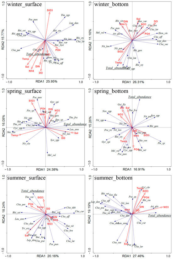 Results of redundancy analysis (RDA) of dominant species abundance and environmental factors (Temp represents temperature, Sal represents salinity, DO represents dissolved oxygen, NO3 represents nitrate, NH4 represents ammonium, DIN represents dissolved inorganic nitrogen, PO4 represents phosphate, SiO3 represents silicate) in surface and bottom water layers of Yazhou Bay across three seasons.