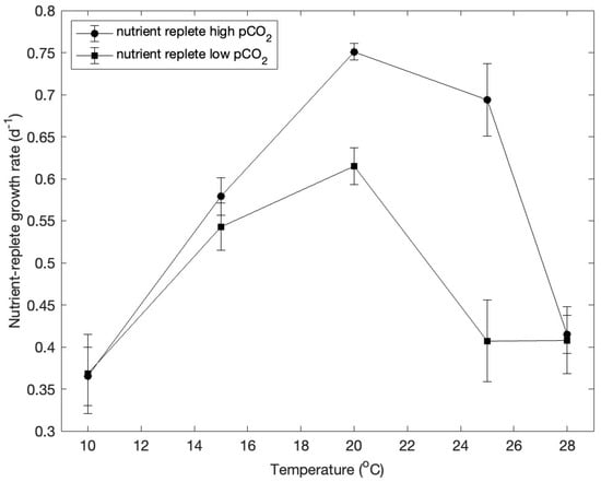 Under nutrient-replete conditions, E. huxleyi was able to grow at temperatures of 10–28 °C (Figure 1). At both high and low pCO2, growth was most rapid at 20 °C. The effect of pCO2 on growth rates depended on the temperature. There was virtually no effect of pCO2 at temperatures of 10 and 28 °C. At temperatures of 15, 20, and 25 °C, growth rates were higher at high pCO2 than at low pCO2, but the difference was statistically significant only at 25 °C (analysis of variance, p = 1.2 × 10−5).