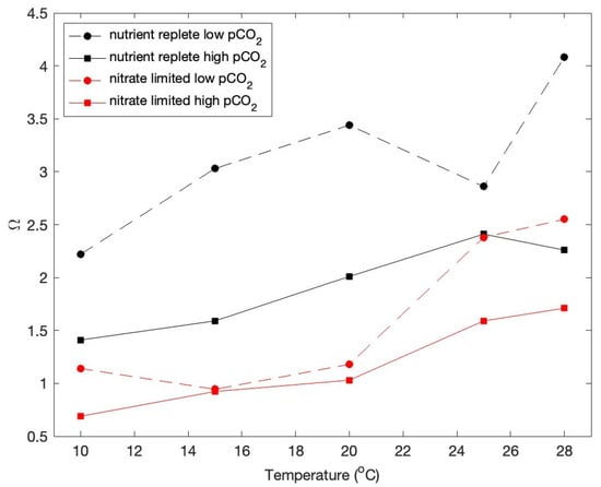 The effect of high pCO2 on calcification has been a focus of several investigations [,,]. In our experiments, Ω changed significantly between nutrient-replete and nitrate-limited conditions, between high and low pCO2, and as a function of temperature, but only temperature significantly affected POC/PIC ratios (Figure 3). The effect of suboptimal and supraoptimal temperatures was clearly to suppress photosynthesis relative to calcification (Figure 1 and Figure 3). Calcification in this case was relatively insensitive to temperature compared to photosynthesis.