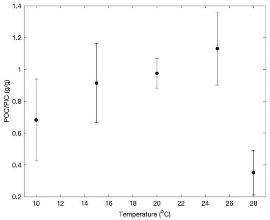 Ratios of POC to PIC versus temperature. Values are means of ratios at high and low pCO2 and nutrient-replete and nitrate-limited conditions. Error bars are standard deviations of the mean values.