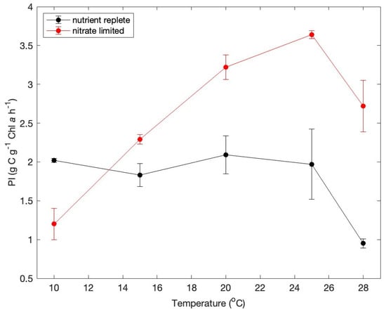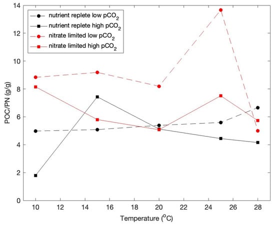 Balanced growth requires that the rates of the light and dark reactions of photosynthesis be equal [,,]. Because light absorption by photosynthetic pigments is independent of temperature, whereas the rates of enzyme-mediated reactions are temperature-dependent, it is reasonable to expect that phytoplankton would allocate relatively more resources to the light reactions and fewer to the dark reactions with increasing temperature at a fixed irradiance. This rationale presumably explains the negative correlation between POC/Chl a ratios and temperature under nutrient-replete conditions (Figure 5). Under nitrate-limited conditions, a similar balance between the light and dark reactions can be achieved by diverting carbon from the dark reactions to storage products [,]. This line of reasoning presumably explains the positive correlation between POC/Chl a ratios and temperature under nitrate-limited conditions and of course the higher POC:PN ratios under nitrate-limited versus nutrient-replete conditions (Figure 4).