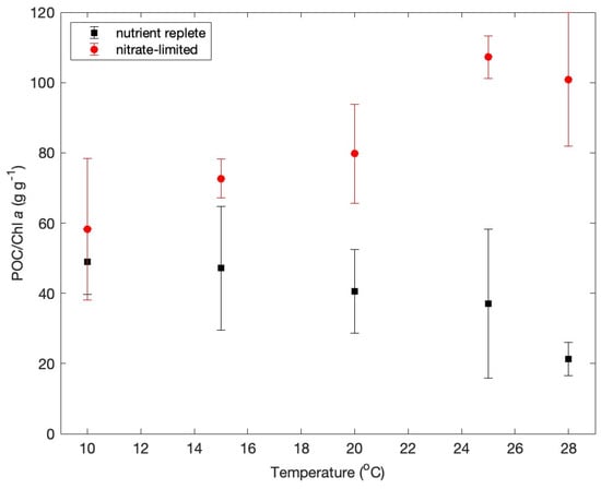 POC/Chl a ratios as a function of temperature under nutrient-replete and nitrate-limited conditions. Error bars show ranges of ratios under high pCO2 and low pCO2.