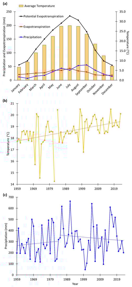 (a) Average monthly temperatures and precipitation recorded by weather stations USC00415999, USW00003047, and USC00414775 in Monahans and Kermit, TX, over the period 1959–2022 [], 52-year average potential evapotranspiration calculated for the town of Midland, TX [], and modeled evapotranspiration for 2016–2023 []. (b) Evolution of the mean annual temperature (MAT) in Kermit and Monahans for the period 1959–2022 []. (c) Evolution of the mean annual precipitation (MAP) in Kermit and Monahans for the period 1959–2022 []. The dashed lines represent the trendlines in temperatures and precipitation.