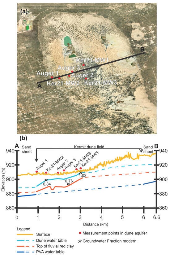 (a) Location of the cross-section AB in Kermit dune field with points of water table measurement. (b) For cross-section AB: elevation profile from The National Map—USGS 1/9 arc-second DEM (yellow), dune field water table elevation profile (light blue), red fluvial clay aquitard elevation profile (red), PVA water table elevation profile (dark blue), and dunes groundwater Fraction moderns (black cross). Solid lines indicate physical measurements from LiDAR, auger and monitoring wells, borings, and Texas Water Development Board (twdb.texas.gov) well records. Dashed lines represent hypothetical continuations of the elevation profiles.