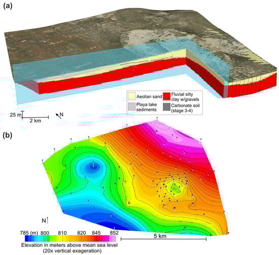 (a) 3D model of the internal stratigraphy of the Monahans dune field with cross-section views, and (b) elevation model of the basal clay unit with contours in meters above sea level []. The dots indicate the location of the boreholes used to make the model.