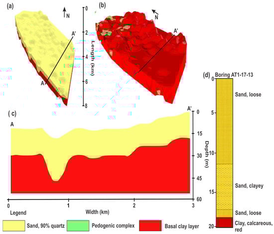 (a) Bird view of the 3D model of the Kermit dune field, showing sand infilling on the basal red clay unit. (b) Bird view of the basal red clay and pedogenic complexes within and below the eolian sand infill in the Kermit dune field. (c) Cross-section A-A’ across the Kermit dune field. (d) Example of borehole AT1-17-13 used to create the 3D model.