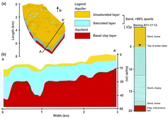 (a) Top view of the 3D model of Kermit dune field. (b) Cross-section of the Kermit dune field, with three layers: the top unsaturated layer, the saturated layer or aquifer, and the basal clay aquitard. (c) Example of borehole log AT1-17-13 used to create the 3D model.
