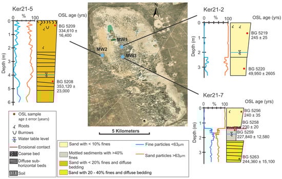 Sediment core Ker21-5, at monitoring well 2, is close to the western edge of the dune field, with the water table at 4m from the surface (Figure 7). This core contains homogeneous sandy sediments with <20% fines and yielded TT-OSL ages of 334 ± 16.4 ka (BG5209) and 353 ± 23 ka (BG5208); a similar age, 347 ± 21 ka (BG4760), was reported for one aeolian unit in the Monahans dune field []. These older sediments are unearthed near the sloping western edge of the Kermit dune field and may indicate net surface erosion.