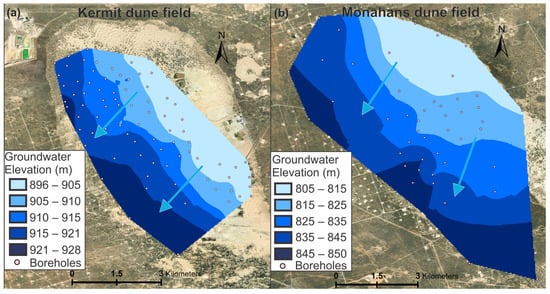 (a) Groundwater elevation in the Kermit dune field measured in 82 boreholes, and (b) groundwater elevation in the Monahans dune field from 49 boreholes. The blue arrows indicate the direction of high to low elevations, most likely reflecting groundwater flow.