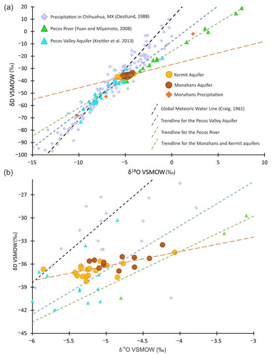 (a) δD and δ18O isotopic ratios for the Kermit and Monahans dune fields, compared to local precipitation, groundwater from the Pecos Valley Aquifer [], the Pecos River [], Chihuahua Desert precipitation [], and the Global Meteoric Water Line []. (b) Close-up on the Kermit and Monahans dune field’s data points.