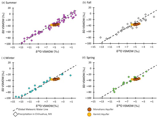 δD and δ18O isotopic ratios for the Chihuahua Desert precipitation measured in a single station in the city of Chihuahua, Mexico, between June 1962 and November 1988 []. The data is color coded per season: summer (pink), fall (gray), winter (blue), and spring (green), and compared to isotopic data from the Monahans and Kermit dune fields.