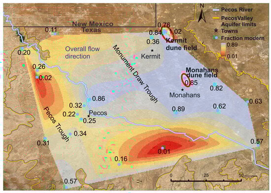 14C Fraction modern measured in MW1, MW2, a production well in Kermit dune field, and a production well in Monahans dune field, integrated with data from Kreitler et al. [].