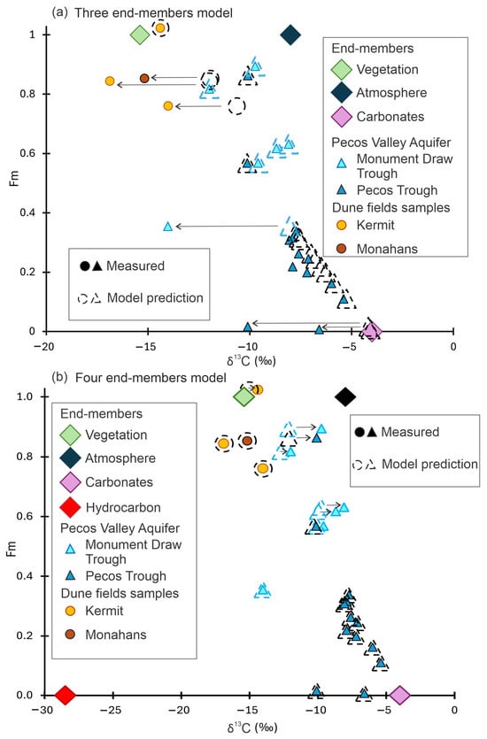 DIC Fraction modern Fm vs. δ13C for groundwater samples of the Kermit and Monahans dune fields, the PVA Monument Draw Trough, and Pecos Trough, compared (a) to a three-components mixing model and (b) to a four-components mixing model, including DIC contributions from pedogenic carbonate, plant respiration and atmosphere sources, and hydrocarbons. The arrows express the displacement of the measured samples compared to the models.