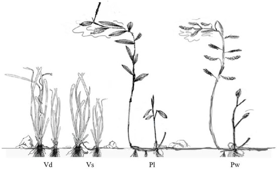 - Wolfer, S.R.; Straile, D. Spatio-temporal dynamics and plasticity of clonal architecture in Potamogeton perfoliatus. Aquat. Bot. 2004, 78, 307–318. [Google Scholar] [CrossRef][Green Version]