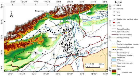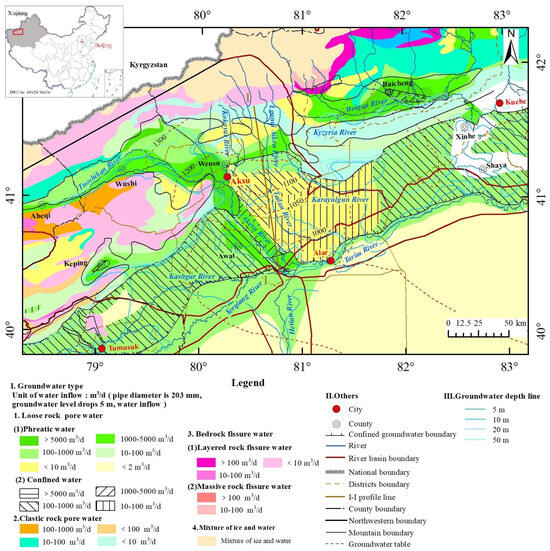 Hydrogeological map of the Aksu River Basin, adapted with permission from [22] (2023, China Light Industry Press Ltd., Beijing, China).