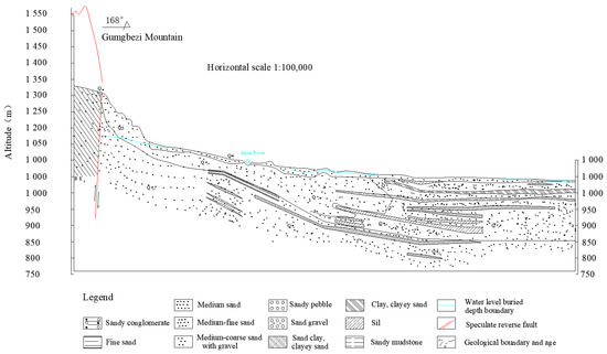 The north–south hydrogeological profile of the Aksu River Basin, adapted with permission from [23] (2021, China Rural Water and Hydropower).