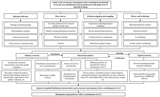 Based on the basic theories of hydrogeology and hydrogeochemistry, the chemical characteristics, arsenic and fluorine content, and distribution of groundwater were analyzed by means of data analysis software, 3S technology, and isotope analysis. The sources of fluorine and arsenic in groundwater were identified, and the influencing factors of arsenic and fluorine co-enrichment were summarized. The typical basin of arsenic and fluorine co-enrichment was selected for in-depth study, and the reverse hydrogeochemical simulation was carried out using PHREEQC 2.12.5 software to summarize the characteristics of arsenic and fluorine co-enrichment. The distribution characteristics and occurrence environment of arsenic and fluorine co-enrichment in the study area were further analyzed, and the mechanism of arsenic and fluorine co-enrichment in groundwater was summarized. The research technology roadmap is shown in Figure 4.