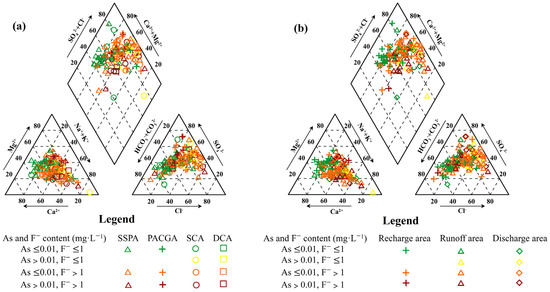 Piper trilinear diagram of groundwater in the study area. (a) Trilinear diagram of As-F content in different groundwater types. (b) Trilinear diagram of As-F content in groundwater based on recharge–runoff–discharge conditions.