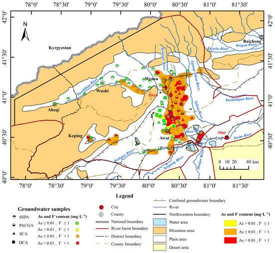 In the plain area of the Aksu River Basin in Xinjiang, the groundwater As content ranged from <0.001 to 0.099 mg·L−1, with an average of 0.010 mg·L−1. High-As groundwater accounted for 26.09% of the total samples. The groundwater F content ranged from <0.1 to 4.9 mg·L−1 with an average of 1.5 mg·L−1. High-F groundwater accounted for 60.87% of the total samples. The As-F co-enriched samples accounted for 18.12% of the total samples.
