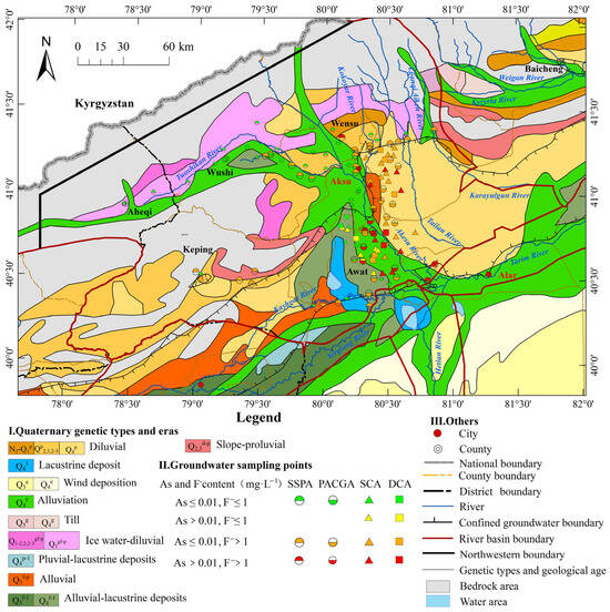 In the Aksu River Basin, high-As groundwater was mainly distributed in the quaternary alluvial plain of the middle and lower reaches of the Aksu River; high-F groundwater was mainly distributed in the quaternary alluvial plain of the middle and lower reaches of the Aksu River, the diluvial plain of the Aksu River, and the Telan River; and a small amount of groundwater was distributed in the alluvial lacustrine plain of the lower reaches of the Kashgar River (Figure 8). As-F co-enriched groundwater was mainly distributed in the quaternary alluvial plain in the middle and lower reaches of the Aksu River and the flood plain in the interfluvial block of the Aksu River and Telan River. According to the geological conditions, the groundwater in the Aksu River Basin was identified as the primary high-As and high-F groundwater.