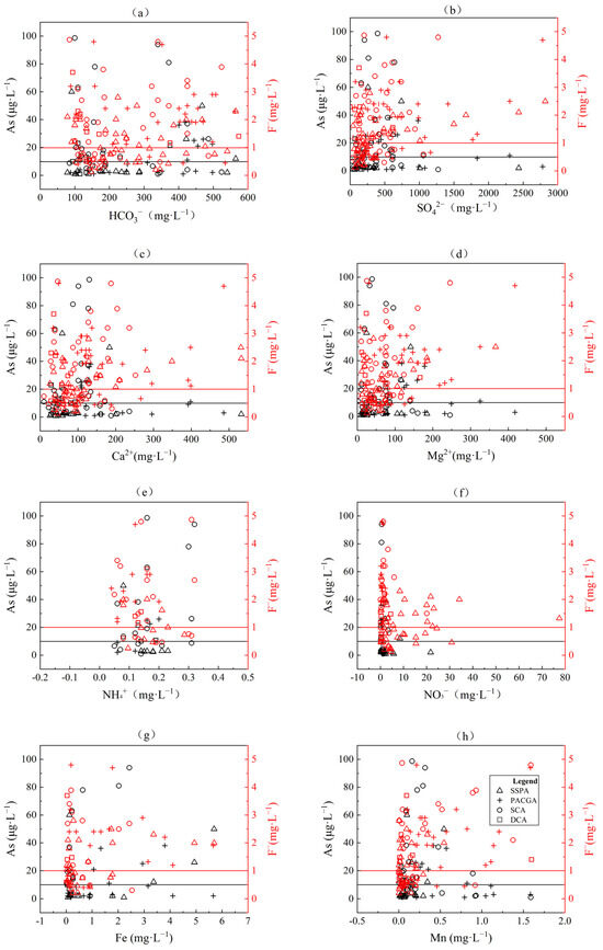 Relationship between As-F content and other hydrochemical indexes in the groundwater. (a) Relationship between As-F content and HCO− in the groundwater; (b) Relationship between As-F content and SO42− in the groundwater; (c) Relationship between As-F content and Ca2+ in the groundwater; (d) Relationship between As-F content and Mg2+ in the groundwater; (e) Relationship between As-F content and NH4+ in the groundwater; (f) Relationship between As-F content and NO3− in the groundwater; (g) Relationship between As-F content and Fe in the groundwater; (h) Relationship between As-F content and Mn in the groundwater.