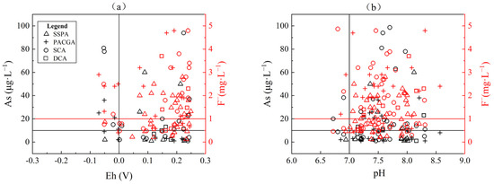 Relationship between As-F content and Eh (a) and pH (b) in groundwater. (a) Relationship between As-F content and Eh in the groundwater; (b) Relationship between As-F content and pH in the groundwater.