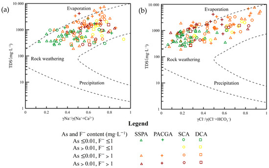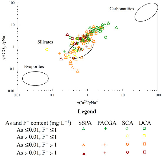 The ratio of γNa+/γ(Na+ + Ca2+) and γCl−/γ(Cl− + HCO3−) in As-F co-enriched groundwater was mostly greater than 0.5 and less than 0.5, respectively, indicating that evaporation and rock weathering were the main influencing factors; that in the high-As or -F groundwater was greater than 0.5, indicating that evaporation and concentration were the main influencing factors [51].