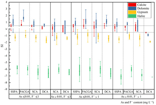 According to the SI of each mineral phase in the groundwater (Figure 13), it can be seen that calcite and dolomite were mainly at saturation or in an equilibrium state in each aquifer. Gypsum and rock salt were mainly dissolved in each aquifer, and the average absolute value of the saturation index of gypsum and rock salt was the smallest in high-F groundwater. The average absolute value of the saturation index of gypsum and rock salt in the As-F co-enriched aquifer was slightly higher. The average absolute value of the saturation index of gypsum and rock salt was the highest in the aquifer where As-F was not exceeded. The results show that gypsum and rock salt in high-As-F groundwater were in a solubility equilibrium state. This is consistent with the fact that SO4·Cl-Na·Mg (Na·Ca·Mg) was the main chemical type of the groundwater with As-F co-enrichment or high-As (or -F) groundwater.