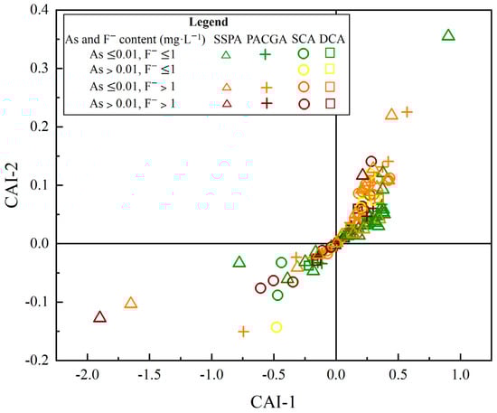 According to the distribution of groundwater CAI-1 and CAI-2 (Figure 14), it can be seen that the groundwater CAI-1 and CAI-2 were mostly positive, indicating the ion exchange of groundwater Na+ and K+ with Ca2+ and Mg2+ in the aqueous medium. The CAI of the groundwater with As-F co-enrichment in the phreatic aquifers (including SSPA and PACGA) was mostly positive, while the groundwater CAI in the confined aquifers (including SCA and DCA) was mostly negative. Therefore, cation alternating adsorption was one of the important reasons affecting the As-F co-enrichment of the groundwater.