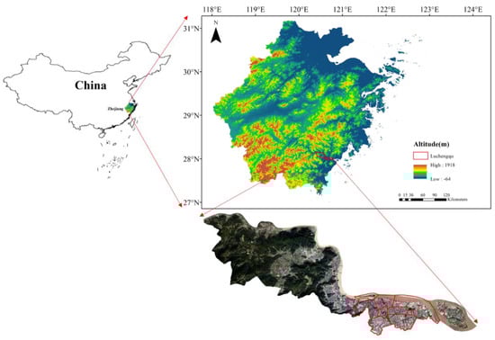 Lucheng District, located in the southeast of Zhejiang Province, is a district under the jurisdiction of Wenzhou City. It is the seat of the Wenzhou Municipal People’s Government and serves as the political, economic, and cultural center of Wenzhou City. Figure 1 illustrates the location of the study area. The district boasts a developed economy and a dense population of 1.209 million. It covers a total land area of 292.8 square kilometers, including 15,549.99 hectares of agricultural land, 8700.00 hectares of construction land, and 3850.10 hectares of water. For our study, we selected eight highly urbanized sub-district administrative units within Lucheng District, including Nanjiao, Puxie, Wuma, Binjiang, Guanghua, Danan, Nanhui, and Songtai (the area enclosed by the bold red wireframe in Figure 1). This district experiences subtropical ocean monsoons. The hottest month is July, with an average temperature of 27 °C, while January is the coldest with an average temperature of 7.6 °C. The annual average temperature is 18 °C. The annual precipitation ranges from 1100 to 2200 mm, and the frost-free period lasts roughly 280 days. The Lucheng district’s terrain consists primarily of plains, mountains, hills, and islands. Typhoons, rainstorms, floods, droughts, hot temperatures, lightning strikes, and landslides are natural disasters that occasionally happen.