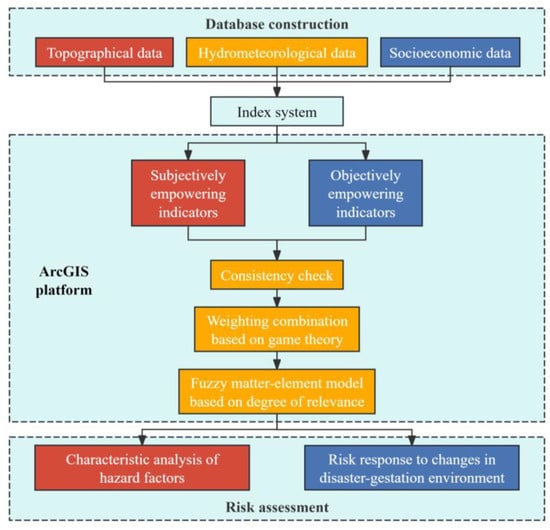 The process of this study is outlined in Figure 2. Initially, a database is constructed to systematically collect topographic, hydrometeorological, and socio-economic data, providing a comprehensive and accurate information foundation for the assessment. Subsequently, the data are imported into an indexing system, encompassing both subjective and objective enabling indicators to reflect the diverse characteristics of disaster risks fully. On the ArcGIS platform, a consistency check is conducted to ensure the accuracy and uniformity of all data, laying a solid foundation for subsequent assessment tasks. Next, game theory methods are utilized to perform weight combinations for various indicators, scientifically determining their importance in risk assessment, thus making the assessment results more objective and reasonable. Then, a fuzzy matter-element model based on correlation degree is employed to deeply analyze the internal relationships among indicators, further enhancing the precision and reliability of the risk assessment. Finally, the risk assessment stage begins, where a comprehensive evaluation of flood disaster risks is conducted by analyzing multiple aspects such as historical flood characteristics, hazard factors, risk responses, and changes in the disaster management environment. This provides scientific evidence and decision-making support for disaster management and response.