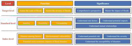 This hierarchical classification justifies its ability to provide a structured yet flexible flood disaster risk assessment framework. Decomposing the complex risk into manageable components facilitates a detailed and precise analysis of each factor’s contribution to the overall risk. Furthermore, this approach ensures that no crucial aspect is overlooked, enhancing the comprehensiveness and accuracy of the assessment. Ultimately, such a hierarchical structure supports evidence-based decision-making, enabling stakeholders to develop and implement effective flood disaster management strategies (Table 1).