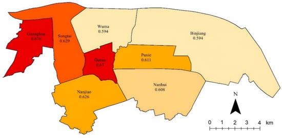According to the classification of the comprehensive index in Table 6, corresponding to the data in Table 11, under the design rainfall conditions, the comprehensive index of flood disasters of each street in the Lucheng district varies in size, and there is a slight difference. However, each street’s comprehensive index of flood disaster varies between 0.5 and 075. All of them are in the medium-risk zone. The exponential distribution is shown in Figure 4 and Figure 5.