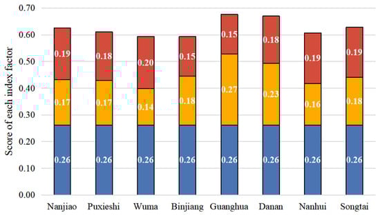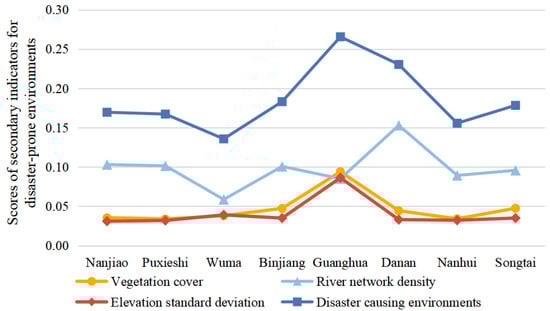Figure 6 displays the secondary index score of the disaster-causing environment. By analyzing the trend of three secondary indexes, the river network density evaluation has the highest positive association with the evaluation of disaster-prone areas, except Guanghua Street. In disaster-prone areas, river network density is the most significant secondary index compatible with factor weighting. The ability to mitigate danger is generally higher in the denser the river network. Therefore, the total deployment should concentrate on regions with comparatively low river network density under severe weather conditions.