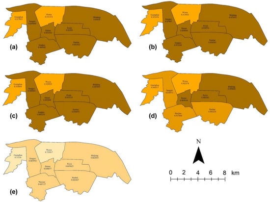 Before adopting the combined weighting method, we must first check the consistency of the weight results calculated by different weight calculation methods since the weight indexes calculated by different weights will be different and even in conflict. Suppose that the weights determined by k weight calculation methods are to be combined weighting. When k = 2, the consistency test of the subjective and objective weighting method uses the Spearman rank correlation coefficient to characterize. Distance function, , can describe the degree of consistency of subjective and objective empowerment methods. When , the smaller , the closer the result of subjective and objective empowerment [43].