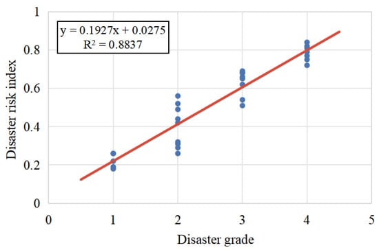 Accuracy test of flood disaster risk index. The disaster grade in the figure is divided into four levels: 1, 2, 3, and 4, with level 1 being the most severe and level 4 being the least severe.
